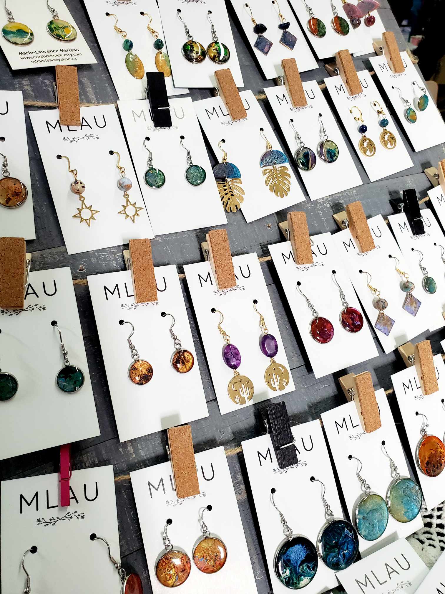 En plus de ses chandelles, MLAU conçoit des boucles d'oreilles uniques, colorées et audacieuses, fabriquées à l'aide d'un amalgame de différentes techniques de peinture. Chaque modèle représente une toile abstraite, prête à être portée par celui ou celle qui veut ajouter de la couleur à son quotidien.