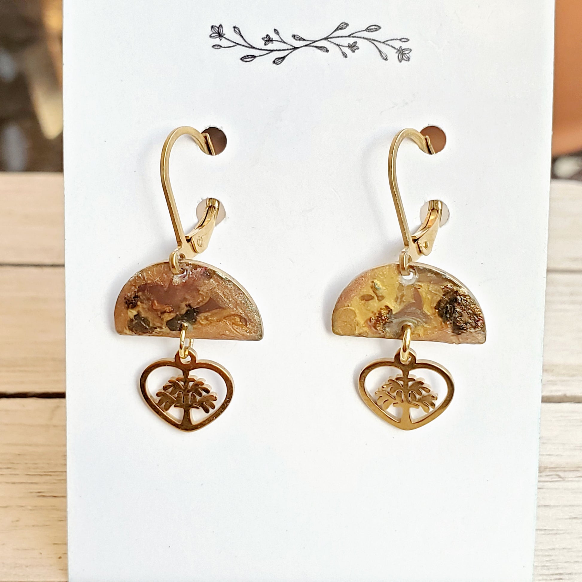 Boucles d'oreilles avec deux breloques en laiton et en acier inoxydable. Celle en laiton est peinte à la main. Modèle unique.